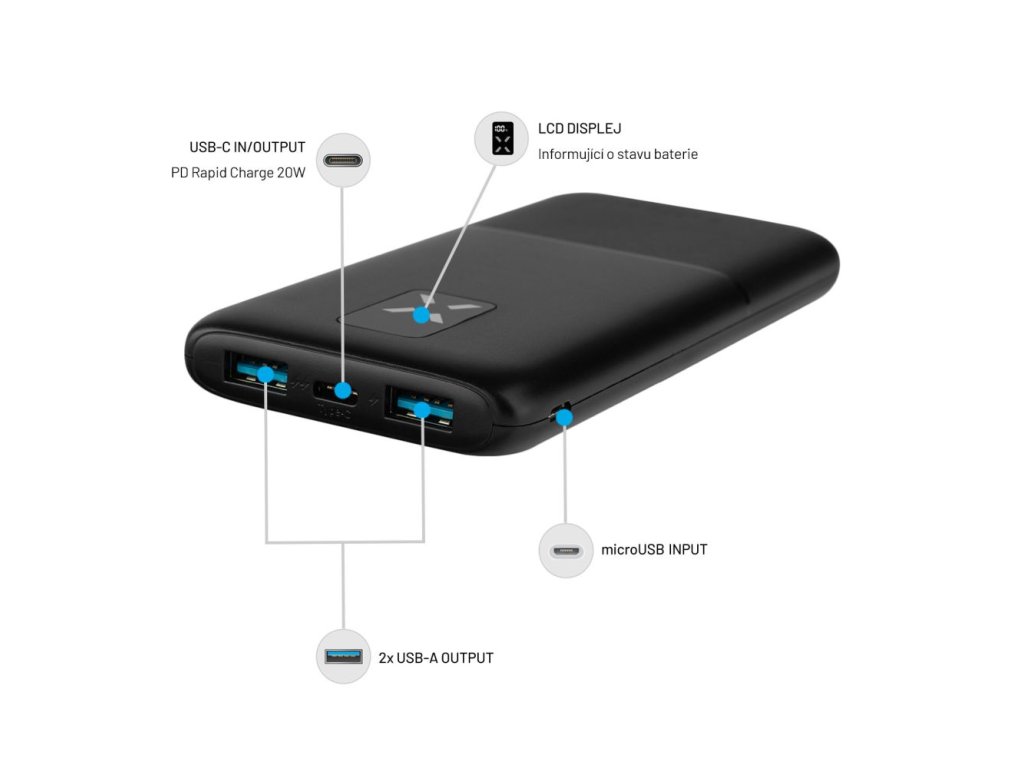 - rychlé dobíjení powerbanky pomocí microUSB/USB-C portu